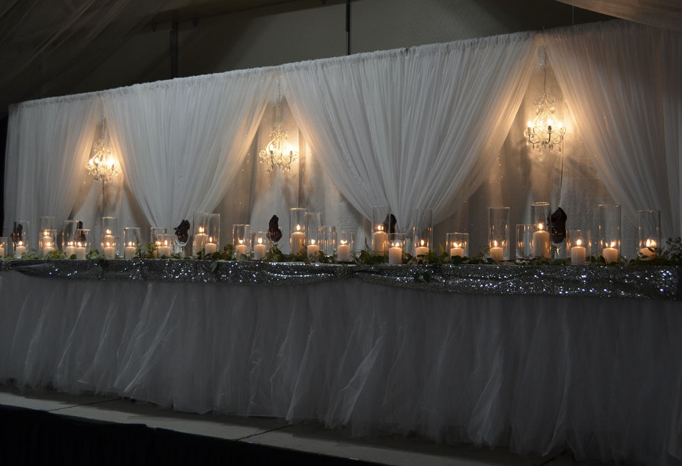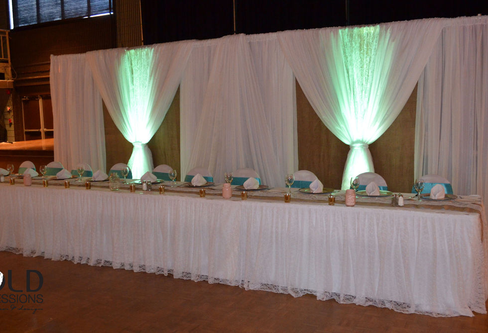 Choose from a wide selection of fabrics and colours to customize your backdrop for your event. Add elements such as hanging chandeliers, accent drapery, felt cutouts, and colour changing lights to create that special look.